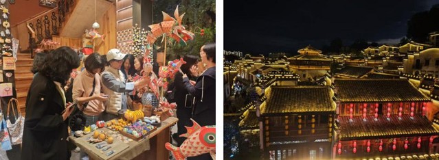 随后,众人打卡婺源新地标——弦高古城。它坐落于1100多年前的婺源县治弦高镇,因“后有靠山、前有玉带”的独特地形,成为徽州文化、山水意境与现代创意融合的沉浸式文商胜地。这里曾是南宋“婺源西湖”,改造后以“三水”“七巷”“八景”诉说文化故事。暮色降临,青石长街华灯初上,马头墙光影流转,教工们沉浸式感受“推窗见流水、移步入画卷”的诗意,沉醉于古城新颜。