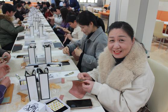 在手作体验环节,专业皮革工艺师带领大家走进皮艺的匠心世界。通过细致讲解与现场示范,老师向大家传授了源自传统马具制作工艺的双针缝制技法。双针交替走线,力道均匀,针脚细密,使卡包每一处边缘都呈现出规整而富有质感的美感。女教职工们专注聆听、细心操作,在穿针引线间感受力与美的和谐共鸣。光影流转间,巧手翻飞,笑语盈盈,勾勒出一幅温暖而生动的节日图景。